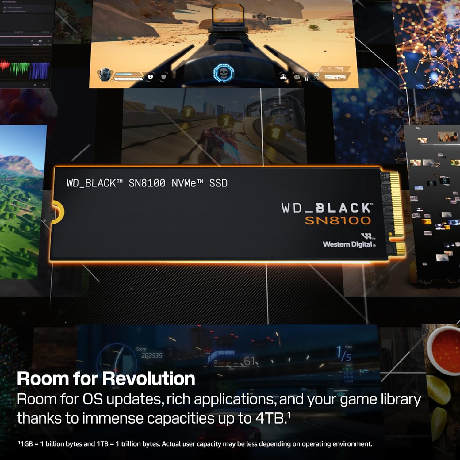 The WD Black SN8100 is a next-generation PCIe 5.0 NVMe SSD built to deliver cutting-edge performance for gaming, content creation, and high-load workloads. Leveraging the PCIe 5.0 interface, it pushes sequential read and write speeds to unprecedented levels, ensuring minimal loading times and fast throughput for demanding tasks. Its robust endurance, advanced controller, and compatibility with modern platforms make it a strong choice for future-proof systems.